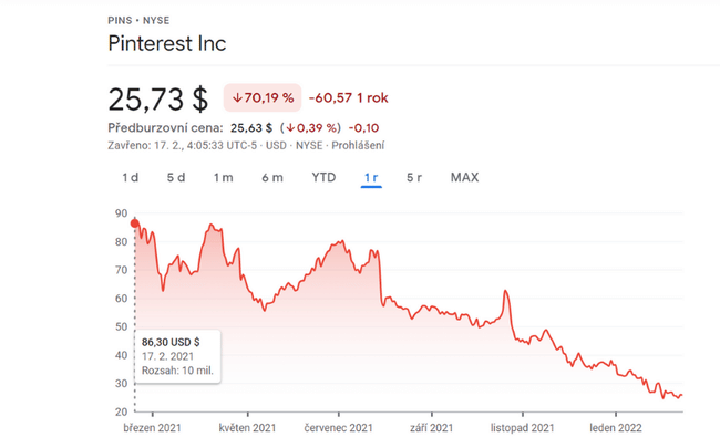 Uzamčení však netrvalo dlouho a šílenství kolem akcií sociálních médií v roce 2021 ochladlo. Navíc na přelomu let 2021 a 2022 došlo k "technologickému krachu". Investoři se zbavili svých akcií PINS, které se propadly o více než 70 % ze svého maxima dosaženého v únoru 2021.
