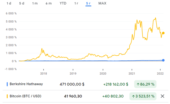 Výše uvedený graf představuje zajímavé srovnání 2 aktiv, kdy Bitcoin vítězí na plné čáře. Pokud porovnáme tyto 2 aktiva od té doby, kdy se začali veřejně obchodovat, zhodnocení Bitcoinu je stále zhruba dvojnásobné oproti akciím Berkshire Hathaway.