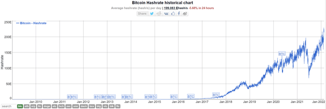 Výpočetní výkon potřebný pro běh síťe bitcoinu pokračuje v růstu a 15. února 2022 dosáhl dalšího historického maxima, a to 249 exahashů za sekundu (EH/s). V návaznosti na nejnovější ATH se ve čtvrtek ráno zvýšila těžební obtížnost sítě o 4,78 %. Od 28. listopadu 2021 se těžební obtížnost zvýšila šestkrát za sebou, takže od té doby je pro těžaře bitcoinů o 23,34 % těžší najít odměnu za blok bitcoinu.