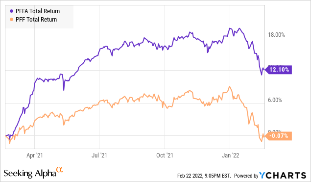Za poslední rok PFFA výrazně překonala výkonnost svých kolegů, jako je iShares Preferred & Income Securities ETF (PFF).
