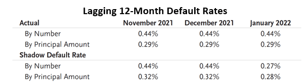 Míra selhání je rekordně nízká a "stínová míra selhání", která měří dlužníky, kteří porušili smlouvu nebo mají ratingovou agenturou hodnocení nižší než CCC, naznačuje, že míra selhání pravděpodobně zůstane nízká. Agentura Fitch předpovídá pro rok 2022 míru selhání kolem 1,5 %. Což je pro ECC fantastická zpráva!