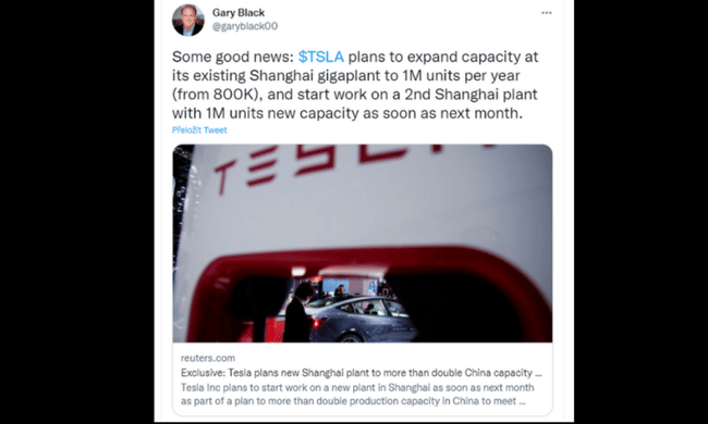 Nějaké dobré zprávy: $TSLA plánuje rozšířit kapacitu svého stávajícího gigazávodu v Šanghaji na 1 milion jednotek ročně (z 800 tisíc) a zahájit práce na 2. šanghajské továrně s novou kapacitou 1 milion jednotek již příští měsíc.