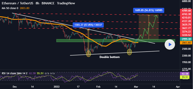Jak je znázorněno v grafu, cena $ETHUSD testuje trendovou linii a velmi tvrdě se pokouší tyto úrovně překonat. Přesto čelí některým odmítnutím, ale kupující jsou dostatečně silní, aby udrželi cenu nad čarou. Analytik také poukázal na vytvořený vzor dvojitého dna a trendová čára je výstřih. A proto průlom odtud může potvrdit vzestupný trend, který by zase mohl zažehnout býčí běh směrem k cílovým oblastem 4000 USD.