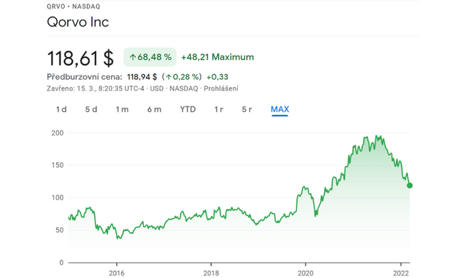 Třetí růstovou akcií, u které budete litovat, že jste ji nesehnali, když se Nasdaq dostal do teritoria medvědího trhu, je dodavatel radiofrekvenčních systémů Qorvo $QRVO.