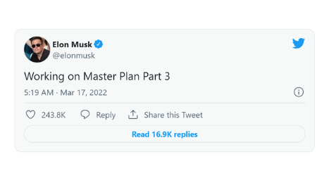 Generální ředitel Elon Musk napsal původní hlavní plán Tesly $TSLA v roce 2006. Část Deux (pojmenování plánu) byla vydána v roce 2016. Nyní Musk říká, že část 3 přichází.