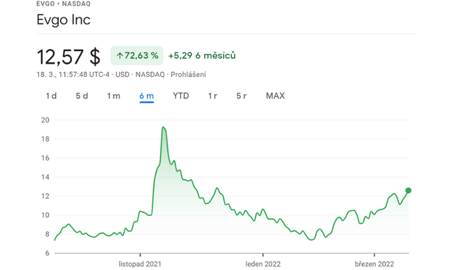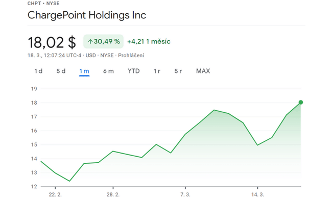 Od 24. února do 10. března akcie vyskočily o 30%. Rally přišla poté, co společnost zabývající se nabíjením elektromobilů oznámila, že uzavřela dohody o poskytování rychlých nabíječek pro některé zákazníky dvou velkých japonských automobilek - Subaru a Toyota (NYSE: $TM).