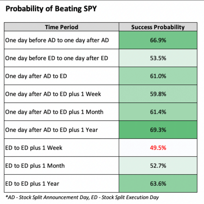 Hodnoty jsou celkem překvapivé. Z tabulky vyplívá, že téměř vždy se vyplácí kupovat okolo splitu akcií. V takovém případě vám pravděpodobnost poražení trhu hraje do karet. Otázkou je, jestli to stojí za ty starosti kolem.