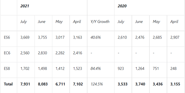 Za měsíc červenec společnost NIO vykázala 124,5% meziroční růst dodávek. Čínský výrobce elektromobilů dodal minulý měsíc 7 931 vozů, z nichž většinu tvořilo pětimístné chytré elektrické SUV NIO ES6. NIO dodalo 3 669 vozů ES6 (46 % celkových dodávek), 2 560 vozů EC6 (32 % dodávek), což je pětimístné elektrické sportovní kupé NIO, a 1 702 vozů ES8 (21 % dodávek), což je šestimístné nebo sedmimístné elektrické SUV NIO smart.