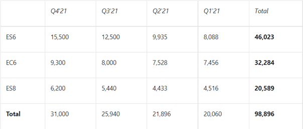 Společnost $NIO snížila svůj odhad výroby za 1. čtvrtletí 21. roku kvůli nedostatku polovodičů na 19 500 modelů, což znamená, že bude dodáno o 1 000 vozů méně, než požadovala ve svém dřívějším výhledu 20 000-20 500 vozů. Společnost NIO nakonec v 1. čtvrtletí 21. roku dodala 20 060 vozů. Ve 2. čtvrtletí NIO dodalo 21 896 vozů, takže čínský výrobce elektromobilů si v dodávkách vedl lépe, než naznačoval jeho výhled. Z tohoto důvodu očekávám, že ve 3. a 4. čtvrtletí může výroba výrazně vzrůst, protože nedostatek čipů přestane $NIO brzdit ve výrobě. Odhaduji, že $NIO se letos přiblíží k hranici 100 000 dodaných vozů, přičemž růst bude tažen především modely EC6 a ES8. Myslím si, že ve 3. čtvrtletí 21. roku bude NIO v průměru dodávat více než 8 000 kusů měsíčně a ve 4. čtvrtletí 21. roku vzroste průměr měsíčních dodávek na něco málo přes 10 000 kusů. V porovnání s mým předchozím výhledem odráží odhad dodávek na rok 2021 dalších 1,840 vozidel, která budou prodána ve druhé polovině roku 2021. Společnost NIO dosud dodala v roce 2021 49 887 modelů (včetně červencových dodávek), což odpovídá 50,4 % mého celoročního odhadu dodávek.