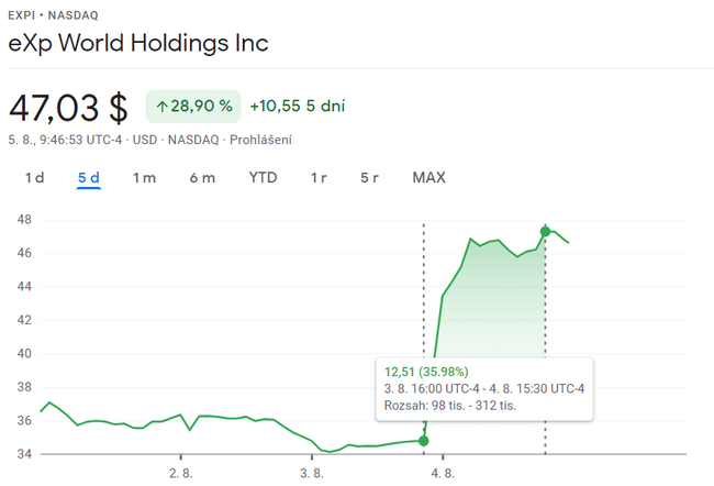 Po včerejším oznámení výsledovky se akcie $EXPI konečně navrátily alespoň přibližně na hodnoty kterých dosahovaly na začátku roku, přesto je čeká k historickému maximu 80 $ ještě dlouhá cesta.