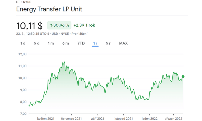 Společnost Energy Transfer $ET se zabývá skladováním zemního plynu a přepravou kapalného zemního plynu, zemního plynu a ropy. Partnerství v hodnotě 31,4 miliardy dolarů funguje hlavně v USA a Kanadě.
