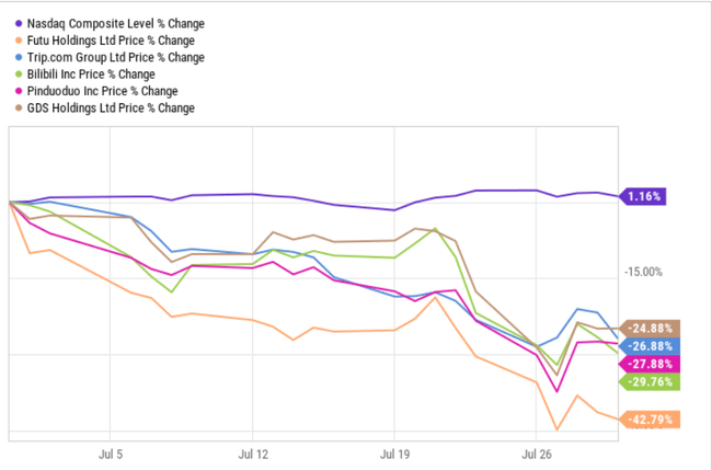 Pokud jste si mysleli, že minulý měsíc byl pro čínské technologické akcie jako Alibaba $BABA a Tencent Holdings $TCEHY špatný, podívejte se o něco níže na žebříčku tržní kapitalizace na mnohem menší firmy. U nich to bylo ještě mnohem horší. Další podobné společnosti kótované na Nasdaqu, jako Trip.com $TRIP a Bilibili $BILI , ztratily v červenci shodně 27 % a 30 % na hodnotě.