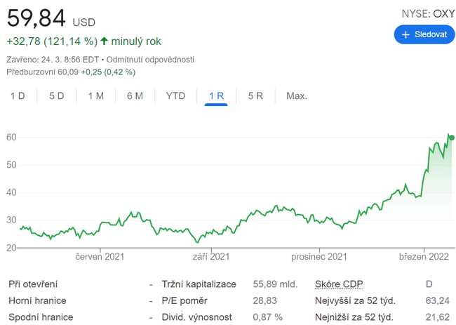 Akcie společnosti Occidental vzrostly na 60,03 USD. Její akcie se letos téměř zdvojnásobily díky rostoucím cenám ropy, pokračujícímu snižování dluhu a obnovenému programu zpětného odkupu akcií.