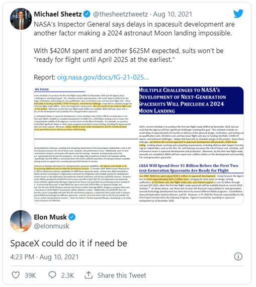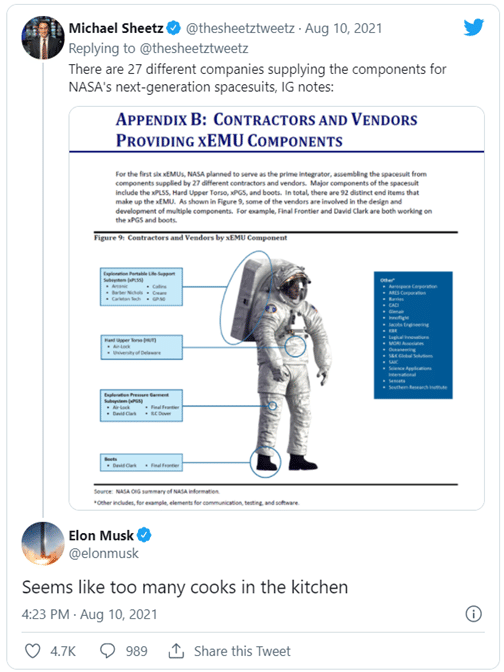 Mluvčí NASA Monica Wittová ve vyjádření pro CNBC k Muskově nabídce poukázala na žádost agentury z minulého měsíce adresovanou společnostem z kosmického průmyslu o zpětnou vazbu ohledně "nákupu komerčních skafandrů, hardwaru a služeb". Vypadá to totiž tak, že Elon o zprávě a možnosti podílet se na vývoji pravděpodobně dávno věděl, jen potřeboval zase na Twitteru ukázat možnosti SpaceX a zpochybnit pohled na myšlenkové pochody NASA, která by byla jinak ochotná za vývoj zbytečně zaplatit až 1 miliardu dolarů.