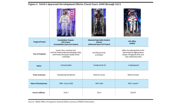 Podle zjištění generálního inspektora zahájila kosmická agentura od roku 2007 tři různé programy kosmických skafandrů a od té doby vynaložila na jejich vývoj 420,1 milionu dolarů. Zpráva navíc uvádí, že NASA "plánuje investovat dalších přibližně 625,2 milionu dolarů" do vývoje, testování a kvalifikace, aby dokončila skafandr pro demonstrační misi na ISS a dva skafandry pro misi s posádkou na Měsíc celkem za "více než 1 miliardu dolarů" do roku 2025.
