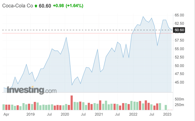 Pohyb akcií spoločnosti Coca-Cola za posledných päť rokov. (Zdroj: Investing) *