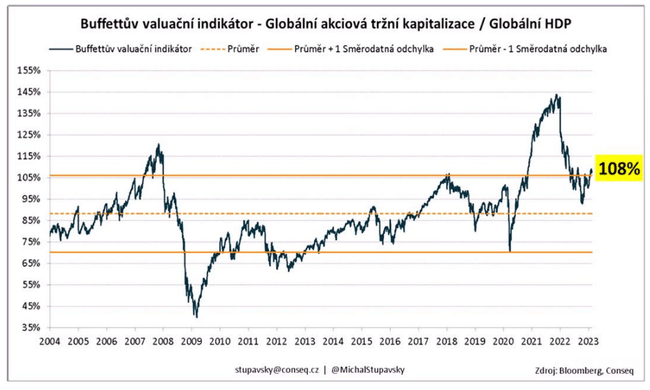Klíčovým důvodem pro toto investiční rozhodnutí byla skutečnost, že si akciové trhy od lokálního dna z 12. října loňského roku dle nejširšího globálního akciového indexu MSCI All Country World ke dnešku připsaly velice silný zisk přibližně 20 %. Domníváme se proto, že by si akciové trhy po takto silné rally zasloužily alespoň dílčí korekci. S tím souvisí také skutečnost, že akcie v celkovém globální průměru od poloviny října velice výrazně podražily, a my jsme nyní toho názoru, že jsou nyní celkové globální akciové valuace poměrně drahé, a to jak absolutně dle valuačních ukazatelů jako P/E či Buffettův valuační indikátor, tak i na relativní bázi vůči dluhopisům.