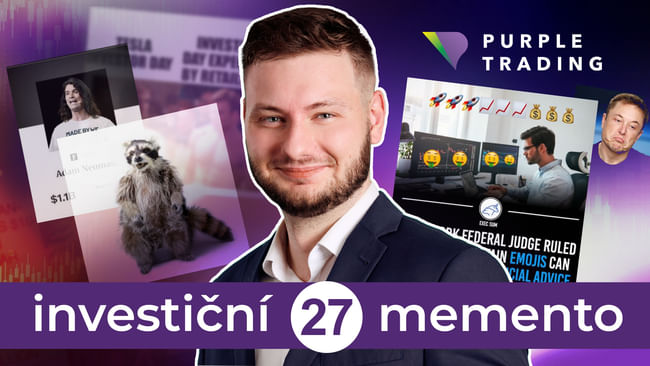 Máte rádi memečka? Protože analytici, investoři a obchodníci je přímo milují a mnohdy se jimi informují o aktuálně nejdůležitějších investičních událostech. Investor a člen Purple Trading Clubu, Petr Lajsek, pro vás každý týden prochází internetové diskuze a fóra a sbírá ty nejpovedenější z vtípků. Ty pak rozebere, dodá k nim kontext a doplňující informace z trhů. To vše pak shrne do videa, na které se stihnete podívat u odpoledního kafe. Dnes vyšlo v pořadí již 27. vydání Investičního Mementa. Na co se můžete těšit?