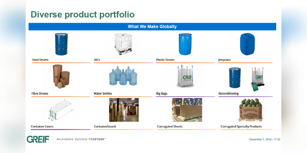 Greif $GEF je americká společnost specializující se na výrobu a distribuci průmyslových obalů. Společnost vyrábí širokou škálu obalů, včetně kovových a plastových sudů, papírových obalů, pytlů a balících materiálů pro průmyslové a komerční zákazníky. Greif také nabízí služby jako návrh a výrobu specifických obalů na míru, výrobu recyklovaných obalů a další.