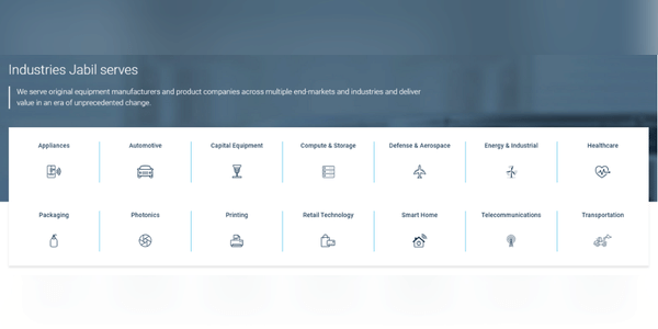 Do těchto odvětví Jabil zasahuje a prodává jim své produkty 👇