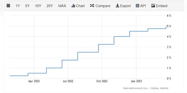 Fed zvýšil sazby o dalších 25 bodů na 4,75 % - 5% v březnu 2023 a tlačí tak náklady na půjčování na nová maxima (nejvíce od roku 2007), protože inflace zůstává vysoká. Rozhodnutí přišlo v souladu s očekáváním většiny investorů, i když někteří věřili, že centrální banka by měla pozastavit cyklus zpřísňování, aby posílila finanční stabilitu.