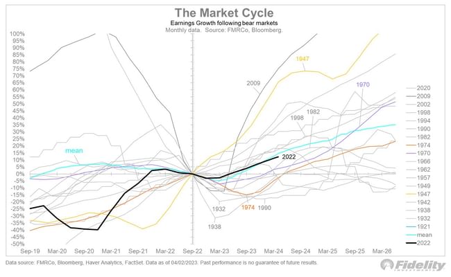 Jsou-li konsensuální odhady zisků věrohodné (což je pochybné), možná je to nejhorší konečně za námi. Černá čára (aktuální odhady) je přímo nad světle modrou čárou (průměr pro všechny tržní cykly).