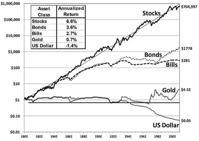 Historie akciového trhu ukazuje, že akcie mají tendenci dlouhodobě růst a poskytují nejlepší anualizovaný výnos (konkrétně největší ze všech zmíněných možností).