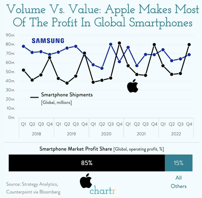 Z hlediska prodaných kusů smartphonů má $AAPL zhruba 30 % podíl na trhu.