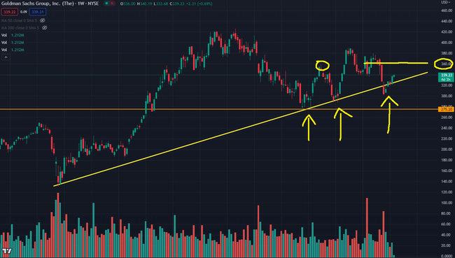 Nakoupil jsem call opci na $GS - spekulace na růst po dnešních earnings. Od bank se očekávají dobré výsledk, tak snad Goldmani navážou na $JPM. Navíc je na grafu nádherný odraz od spodní linie ve stoupajícím trendu. Tento support využila akcie v minulosti již několikrát. Nejbližší rezistence je $360.