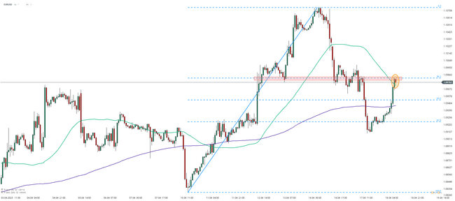 Německé indexy ZEW za duben byly zveřejněny dnes v 11:00. Data se ukázala být smíšená – index očekávání minul odhad tím, že klesl z 13,0 na 4,1 (oček. 15,6), zatímco index současných podmínek se zlepšil z -40 na -32,5 (oček -46,5). ZEW Institute v komentáři k této zprávě poznamenal, že na finančních trzích stále panuje velká nejistota a že to může způsobit, že banky budou s úvěry opatrnější. Ekonomové ZEW navíc vidí vysokou inflaci a restriktivní měnovou politiku jako zátěž pro ekonomiku.