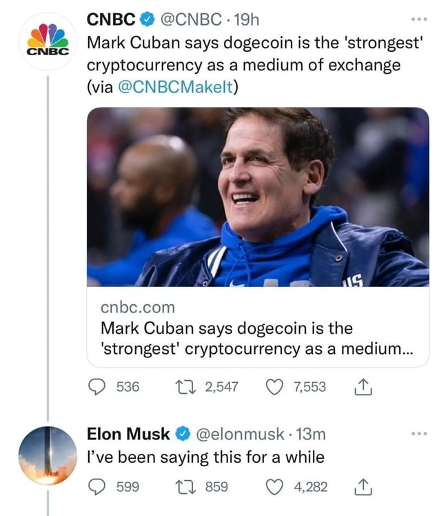 V dubnu Cuban na Twitteru uvedl, že dogecoin $DOGE-USD je "jediná kryptoměna", kterou lidé skutečně používají k transakcím, ačkoli již dříve řekl, že jako digitální měna se používá i ethereum.