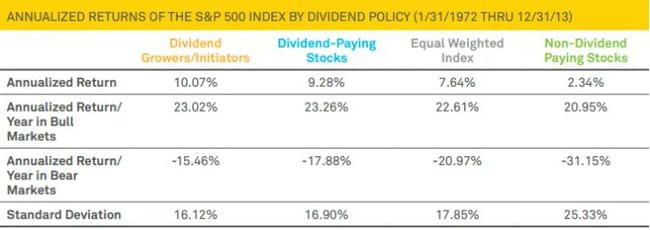 Analýza společnosti Ned Davis Research ukázala, že do prosince 2013 činila standardní odchylka výnosů členů indexu S&P 500 vyplácejících dividendy 16,90 %, zatímco standardní odchylka členů indexu nevyplácejících dividendy 25,33 %.