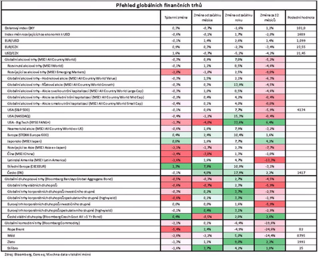 Pokud jde o vývoj na finančních trzích v minulém týdnu, na akciových trzích byl relativní klid, neboť nejširší globální akciový index MSCI All Country World poklesl o nepatrných 0,3 %. Dluhopisovým trhům se na jejich poměry dařilo o něco hůře, neboť nejširší globální dluhopisový index Bloomberg Barclays Global Aggregate Bond oslabil o 0,5 %. Komoditní trhy dle indexu Bloomberg Commodity pak oslabily o 2,1 %.