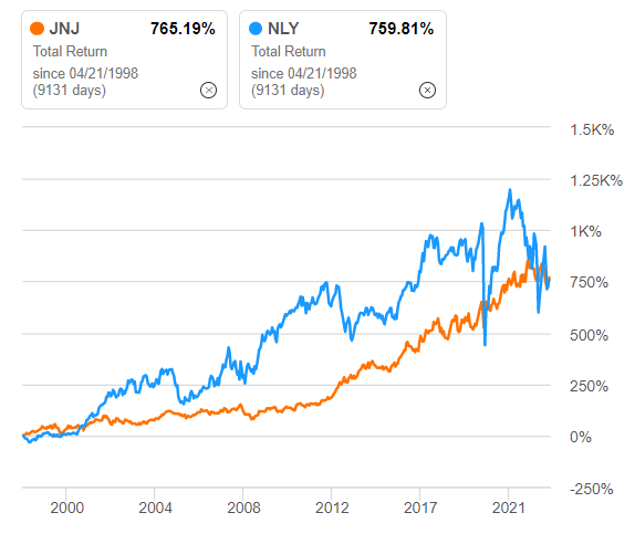 Když vidím grafy obou, tak by se mi asi spalo klidněji s JNJ, konzistentní růst, žádný větší výkyv a v konečném součtu doputovala do stejného cíle jako NLY, akorát u NLY ta cesta byla více šoková a myslím si, že dost lidí mohlo v těch zlomech zpanikařit a rozprodat pozice (NLY ale nastudovanou nemám).