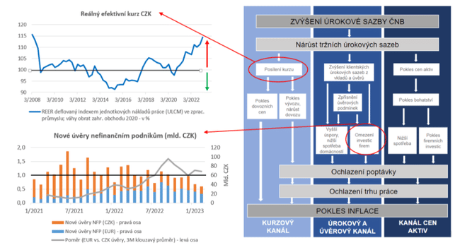 Jednou z kauzalit je, že by vyšší úrokové sazby měly vést k tomu, že si domácnosti a firmy budou brát méně úvěrů. To se děje např. u hypoték, ale pokud jde o firemní úvěry, tak firmy toto „obcházejí“ zcela pragmaticky tím, že si berou levnější úvěry v eurech (viz graf Nové úvěry nefinančním podnikům). A účinnost měnové politiky ČNB, respektive úrokový a úvěrový kanál, je tak kvůli tomu snížena. Podíl nových eurových versus korunových úvěrů nefinančním podnikům se v posledních čtvrtletích obrátil, když se tuzemské firmy více úvěrují v eurech. V ČR věc nevídaná.