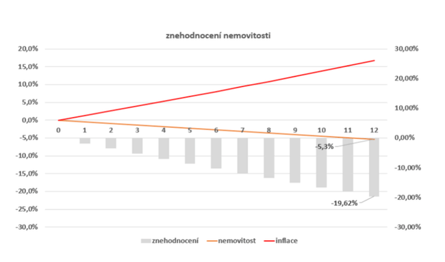 Kumulovaná inflace za posledních 12 měsíců je 17,5 %. Za tu dobu nemovitostní trh klesl o 6,4 %. Pokud dnešní kumulovanou inflaci přičteme k současnému poklesu nemovitostí, dostáváme se na snížení hodnoty nemovitosti v čistém vyjádření po započtení inflace o 20 %. Čirou náhodou od roku 2008 do roku 2011, kde nemovitosti klesaly o 15,5 %, byla inflace malá, pouze 4 %. Kumulované čisté snížení hodnoty po zohlednění inflace vyjde taktéž 20 %. Už z tohohle je podle mého názoru dost pravděpodobné, že nemovitosti už více klesat nebudou a v horizontu 5 - 10 let uvidíme spíše nárůst.