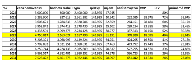 Abychom si ale mohli dopočítat vnitřní výnosové procento (VVP), tedy kolik budeme mít roční výnos, tak je potřeba zohlednit splátky a nájem.
