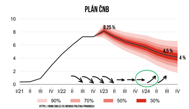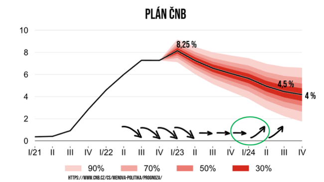 Pokud se podíváme na plán ČNB, pak právě přelom roku 2023 a začátek roku 2024 je pravděpodobně ta nejlepší doba na nákup nemovitostí. V tu dobu by se to zrovna mělo začít lámat, tedy začít růst. Ovšem pokud se podíváme na poslední data, pak dle mého názoru by to mohlo být už na podzim roku 2023.