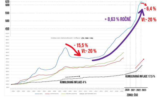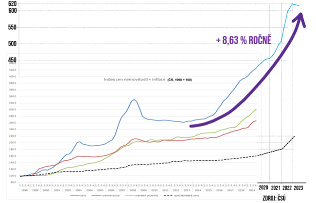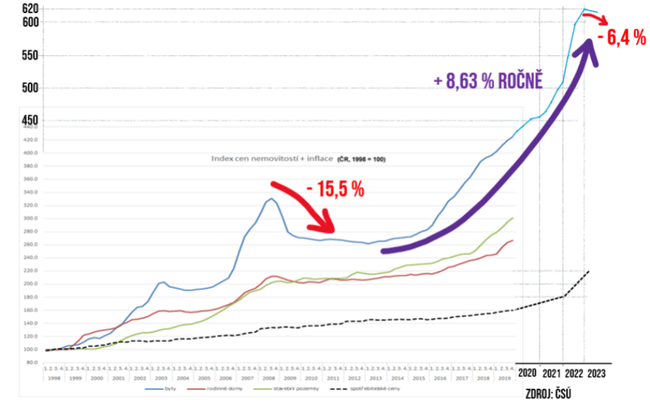 V minulosti za posledních 10 let nemovitosti rostly právě tímto tempem. Vzrostly o 8,63 %, ale vzhledem k tomu, že inflace byla 4 %, byl růst již výše zmíněných 4,63 % nad inflací.