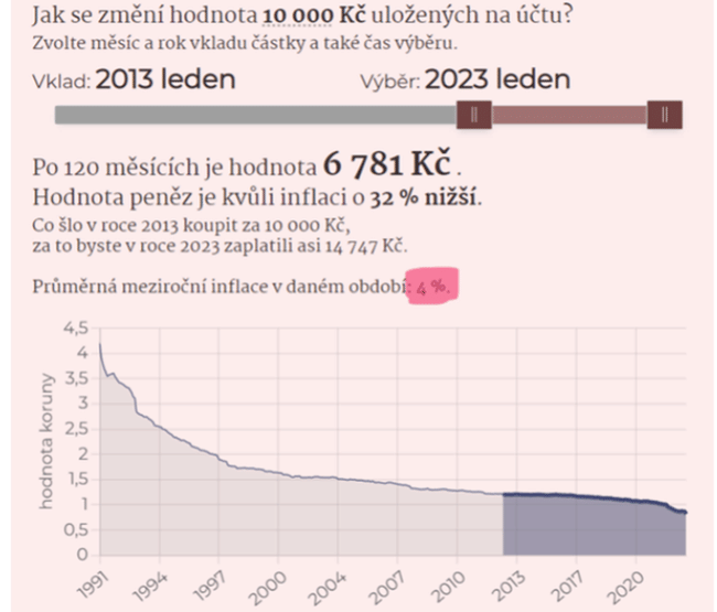 Pokud se podíváme na posledních 10 let, můžeme vidět, že byla inflace 4 % zejména proto, protože poslední 1,5 - 2 roky máme inflaci opravdu vysokou. Dnes jsme ve velmi podobné situaci, akorát na opačné straně. Dnes máme také vysokou inflaci, a jak víme, ČNB už řeší, že bude snižovat sazby. Má sice v plánu, se dostat na 2% inflaci, ale dle mého názoru se jí to nepovede. Za 1 nebo 2 roky, jak ČNB situaci předpokládá v dlouhodobém horizontu, pak vzhledem k tomu, že se nám tu na začátku naakumuluje vysoká inflace, dlouhodobý průměr bude nakonec okolo 5 %.