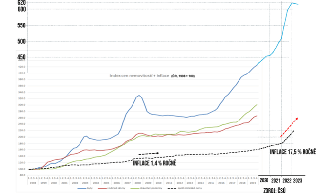 Možná si právě říkáte: „Dnes máme vysokou inflaci, ale ceny nemovitosti klesají, jak může inflace tlačit ceny nemovitostí vzhůru?“ Krátkodobě se může stát naprosto cokoli, ale z dlouhodobého hlediska je inflace jedním z efektů, co tlačí ceny nemovitosti vzhůru.