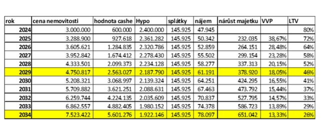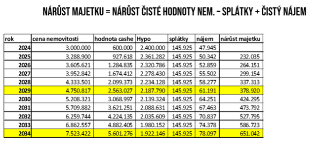 Nárůst majetku spočítáme tak, že od nárůstu čisté hodnoty nemovitosti (3. sloupec hodnota cashe) odečteme splátky, protože ty samozřejmě musíme zaplatit a k tomu přičteme čistý nájem, který navíc získáme. Díky tomu pak hned první rok, tedy v roce 2025, vidíme nárůst čistého majetku 232.035 Kč.