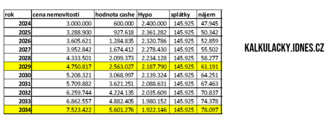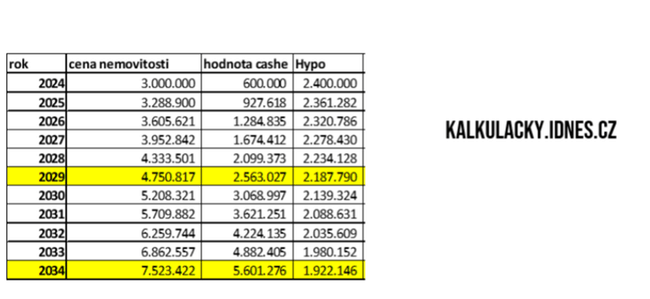 Příklad: V roce 2029 bude hodnota nemovitosti zhruba 4,75 mil. Kč, tím, že budeme mít část hypotéky splacené, získáme přes 2,5 mil. Kč volné hotovosti a právě o to tu jde.