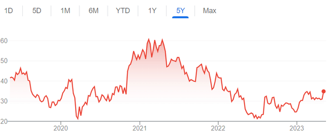 Pohyb akcií spoločnosti Uber za posledných päť rokov. (Zdroj: Google Finance) *