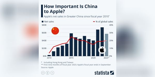 ...Jak ukazuje následující graf, Čína je pro Apple $AAPL velmi důležitým trhem, který představuje zhruba 20 procent celkových tržeb společnosti.